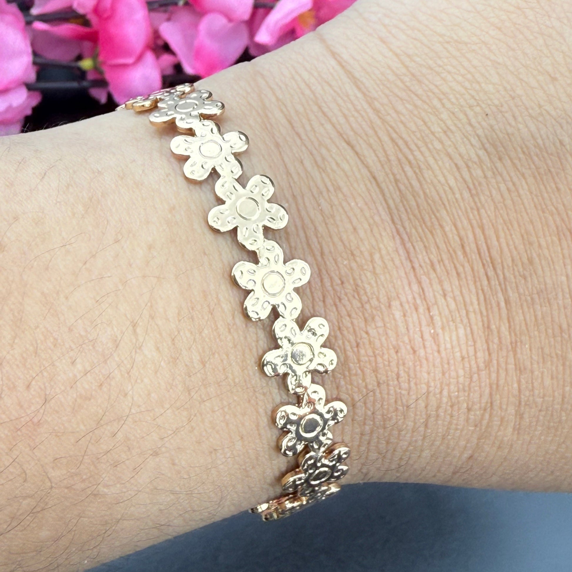 Wear the Dainty Daisy cuff as your primary bracelet for a subtle look. For a trendy, statement wrist, layer it with a heavier gold cuff, a simple beaded bracelet, or your favorite watch. The minimalist design makes it an ideal stacking partner!