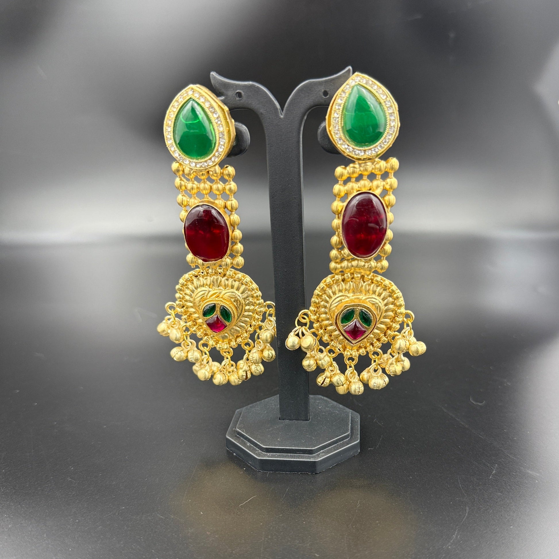 Make an opulent statement with these long gold-tone chandbali earrings, beautifully designed with a rich blend of traditional artistry and modern elegance. Featuring a striking emerald-green teardrop stud and ruby-red oval accents, the earrings are further enhanced with an intricate floral motif embellished with tiny beads and dangling ghungroo-style drops for added charm.